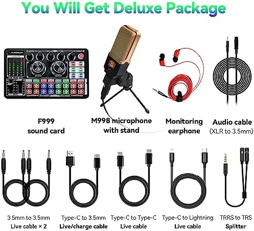 Este paquete incluye todo lo que necesitas para grabar podcasts de alta calidad, con el micrófono profesional F999, que garantiza una captura nítida y clara de tu voz, y la tarjeta de sonido F999 Plus, que ofrece un procesamiento de audio de primer nivel para obtener un sonido impecable.